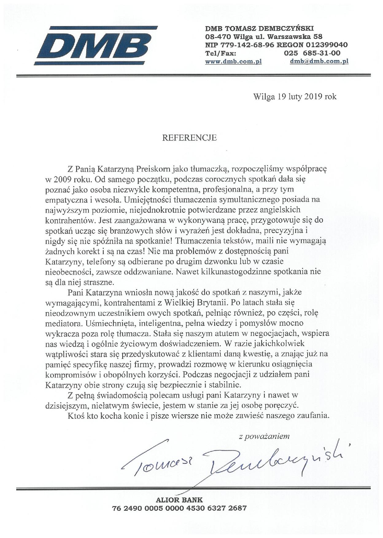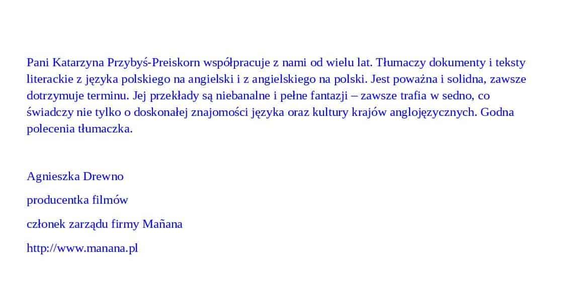 Wśród stale współpracujących ze mną i niezmiernie cenionych klientów znajdują się: Babel Studio, Bell, Calmell, Bi o-Lead Lok B, DMB -Farkom, Edmar, J &M Consulting. InGas, Kabis Global, Kancelaria Adwokacka W. Piechowski-Jóźwiak, Katedra Architektury Krajobrazu SGGW, Largo, Miasto Józefów, Manana, MDML Poland, Media-Plus, Młynkol, MOK Józefów, Nano-Tech Polska, Oficyna Wydawnicza ABA, Piotr Bujnowski Architekt, PPHU Powłoka SPECTRO Poland, Solaris Optics, Top Consulting, Transtext, Translation Cafe, Wydawnictwo Amber, oraz kancelarie prawnicze, notariusze i wiele osób prywatnych